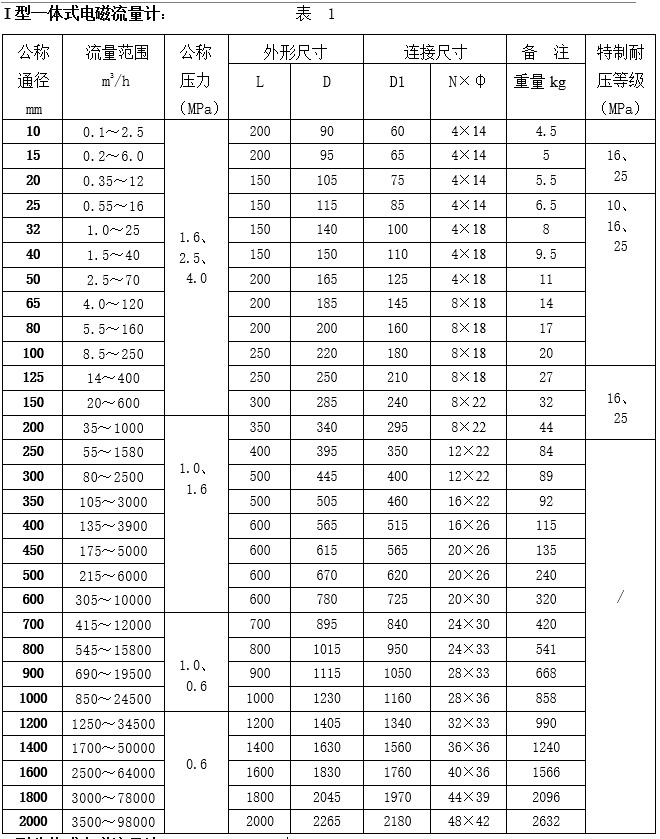 I型一體式電磁流量計(jì)口徑DN(mm): 10、15、20、25、32、40、50、65、80、